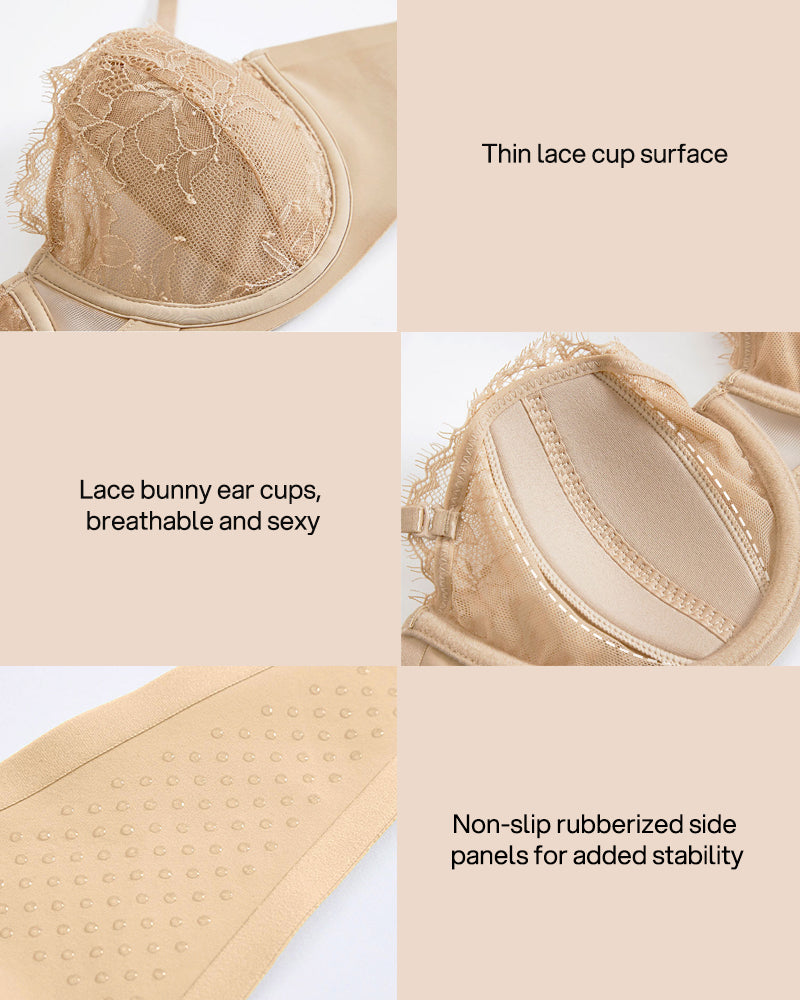 Elevate your everyday with our Demi Lace Bra, a semi-cup silhouette built for light, breathable support. Featuring a dual-craft construction, lace bunny-ear cups, and a memory steel underwire, this bra delivers sexy shaping without sacrificing comfort. Side silicone grips keep you steady all day, so you can feel confident from morning to night.
